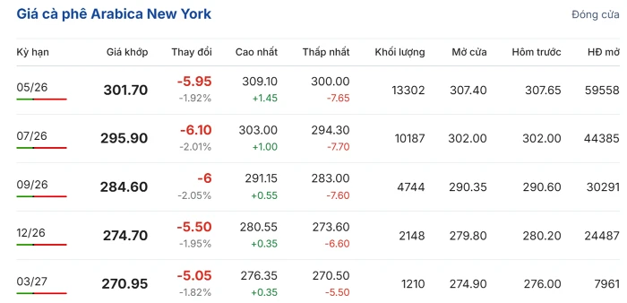 Trong khi đó, trên sàn New York, giá cà phê arabica ghi nhận mức giảm mạnh hơn. Cụ thể, hợp đồng giao tháng 5/2026 giảm 1,92% (5,95 US cent/pound), xuống 301,7 US cent/pound; hợp đồng tháng 7/2026 giảm 2,01% (6,1 US cent/pound), còn 295,9 US cent/pound.