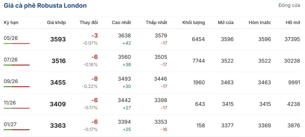 Giá cà phê robusta trên sàn Sàn giao dịch Londongiảm nhẹ ở tất cả các kỳ hạn. Cụ thể, hợp đồng tháng 5/2026 giảm 3 USD/tấn (-0,07%) xuống 3.593 USD/tấn; kỳ hạn tháng 7/2026 lùi 6 USD/tấn (-0,16%) còn 3.516 USD/tấn; trong khi hợp đồng tháng 9/2026 mất 8 USD/tấn (-0,22%), về mức 3.455 USD/tấn.