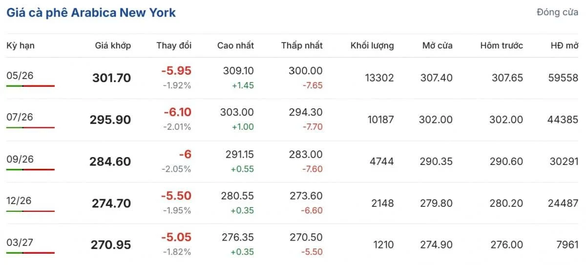 Cùng xu hướng, trên Sàn giao dịch cà phê New York, trên sàn New York, khi giá cà phê arabica giảm gần 2% ở các kỳ hạn. Hợp đồng tháng 5/2026 giảm 5,95 cent/lb (-1,92%) xuống 301,70 cent/lb; kỳ hạn tháng 7/2026 giảm 6,10 cent/lb (-2,01%) còn 295,90 cent/lb; hợp đồng tháng 9/2026 cũng mất 6 cent/lb (-2,05%), xuống 284,60 cent/lb.