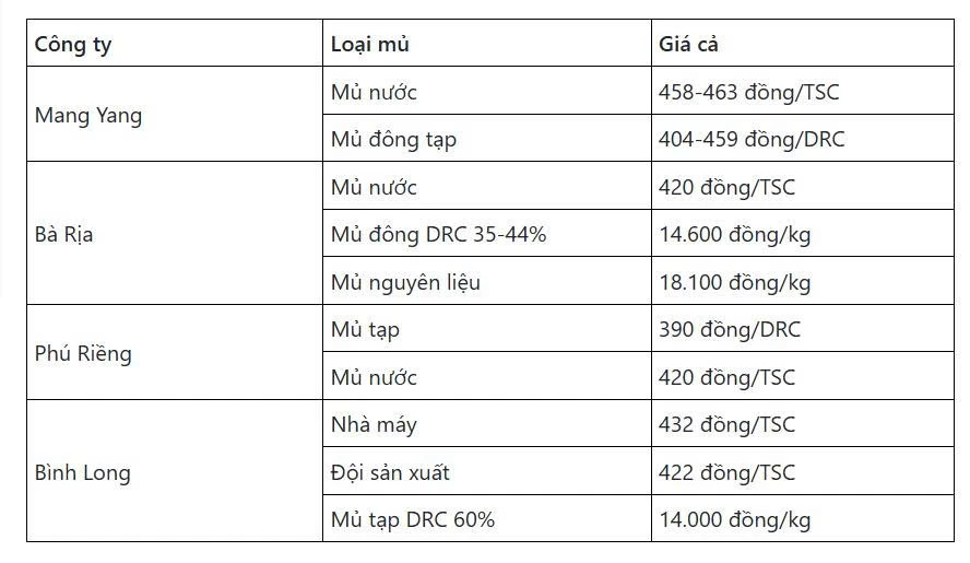 Theo đó, giá mủ cao su loại nước tại Công ty Mang Yang đang từ 458-463 đồng/TSC; mủ đông tạp thu mua quanh mức 404-459 đồng/DRC.