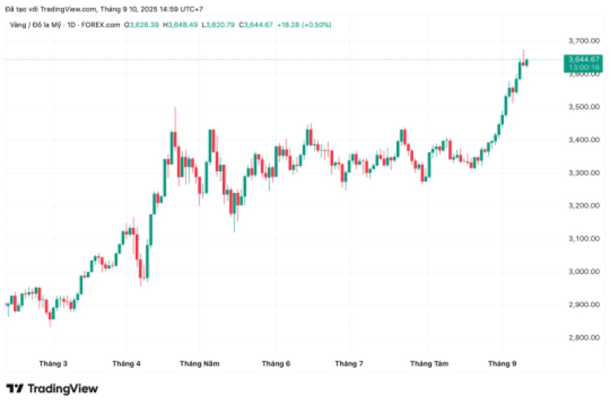 Tính đến 11 giờ ngày 10/9 (giờ Việt Nam), giá vàng thế giới tăng 42 USD so chốt phiên trước đó lên mức 3.637,3 USD/ounce. Giá vàng thế giới đã tăng mạnh lên trên 3.600 USD/ounce khi thị trường chuẩn bị cho khả năng Cục Dự trữ Liên bang Mỹ (FED) cắt giảm lãi suất trong năm nay.