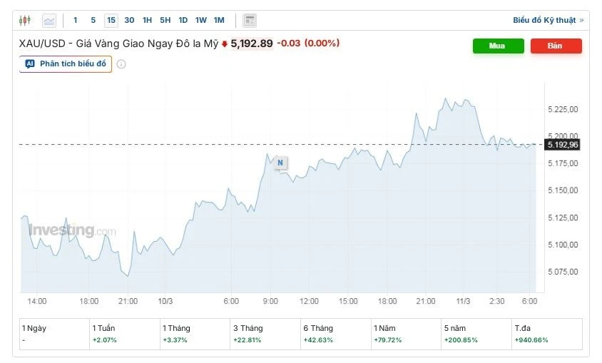 Theo dữ liệu từ Kitco, vào sáng ngày 11/3 (giờ Việt Nam), giá vàng thế giới dao động quanh ngưỡng 5.192 USD/ounce, phục hồi nhẹ khoảng 37 USD so với mức đáy 5.155 USD của phiên đêm trước.