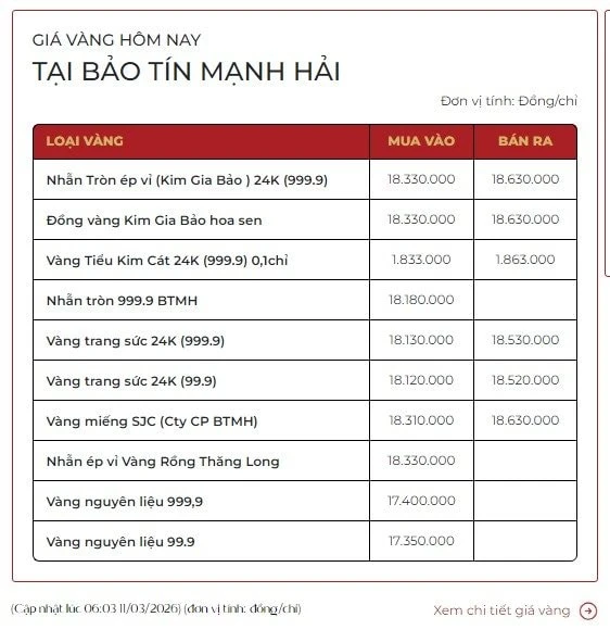 Tương tự trong 24 giờ qua, giá vàng nhẫn Kim Gia Bảo của Bảo Tín Mạnh Hải niêm yết quanh mức 183,3 triệu đồng/lượng (mua vào) và 186,3 triệu đồng/lượng (bán ra).