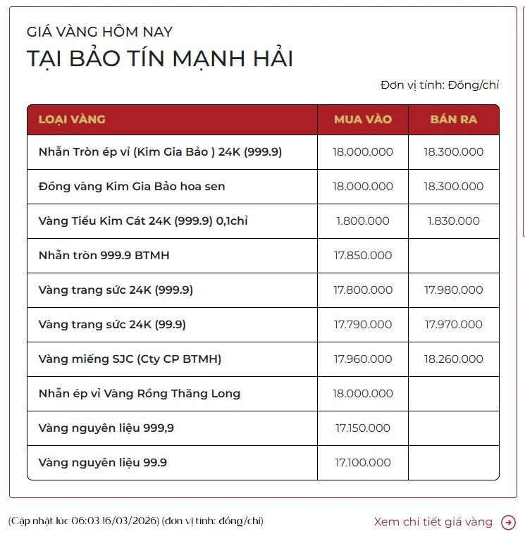 Trong khi đó tại Bảo Tín Mạnh Hải, dòng sản phẩm chủ lực là Nhẫn tròn ép vỉ Kim Gia Bảo 24K (999.9) đã giảm mạnh, hiện niêm yết ở mức 180 triệu đồng/lượng (mua vào) và 183,00 triệu đồng/lượng (bán ra), giảm khoảng 2 triệu đồng/lượng so với phiên trước đó.