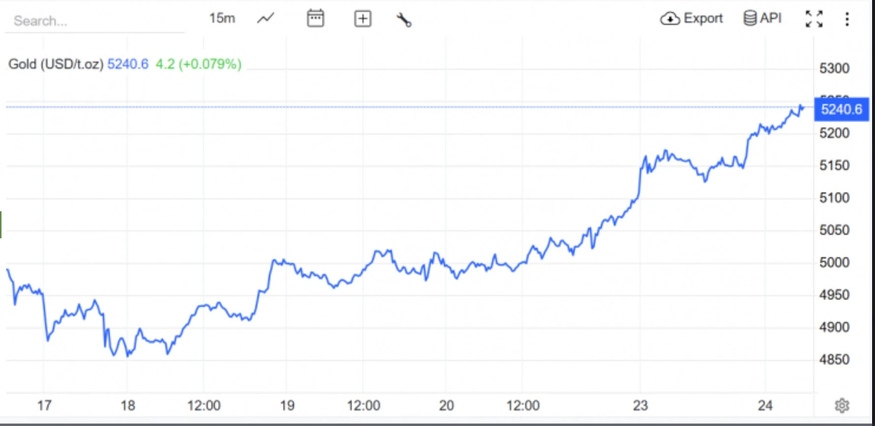 Đáng chú ý, giá vàng chốt phiên cuối tuần tại thị trường Mỹ cũng đạt khoảng 5.243 USD/ounce, tăng tới 135 USD/ounce, cho thấy xu hướng tăng vẫn đang được củng cố mạnh mẽ.