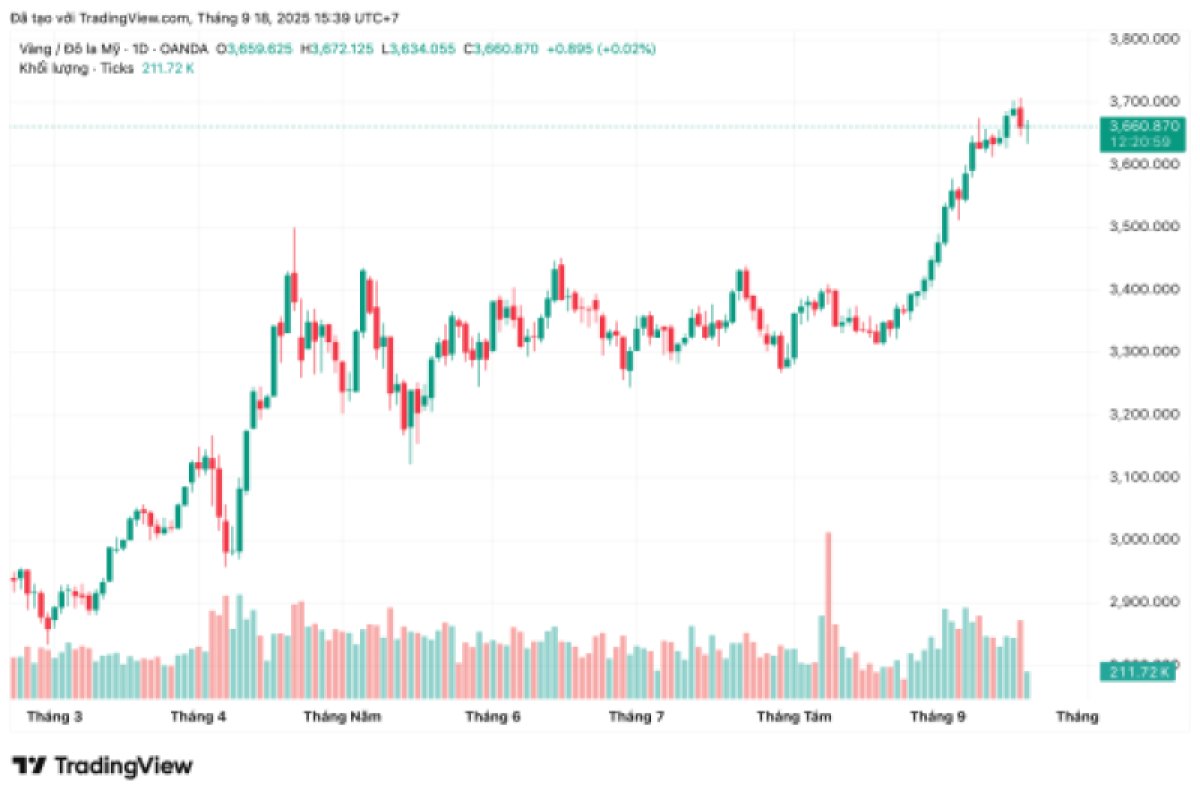 Tính đến 10 giờ 30 phút ngày 18/9 (giờ Việt Nam), giá vàng thế giới giảm 9,9 USD/ounce so kết phiên hôm trước xuống mức 3.661,8 USD/ounce