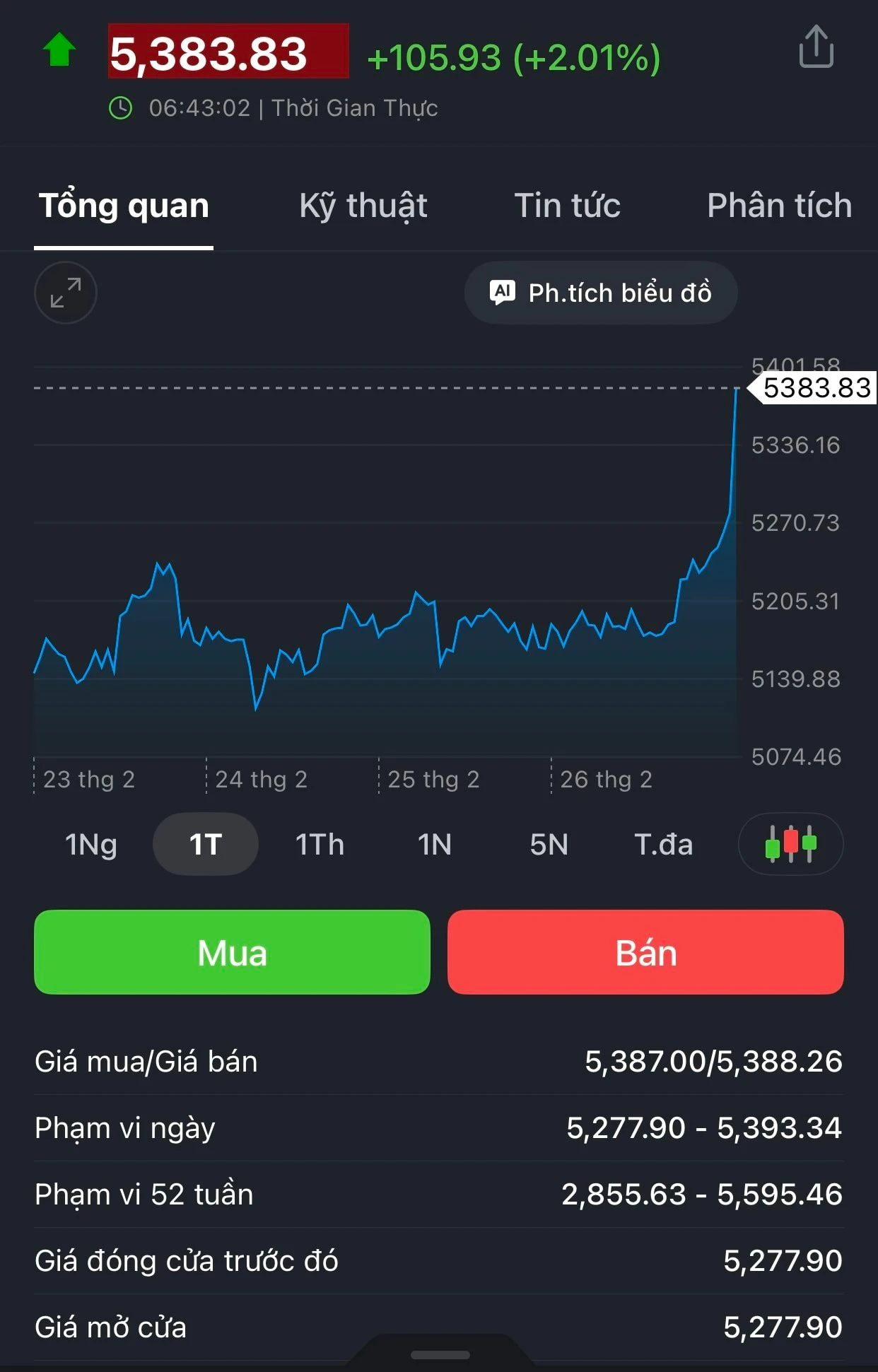 Theo cập nhật từ Kitco và Trading Economics, tính đến rạng sáng 2/3/2026 (giờ Việt Nam), giá vàng giao ngay vượt ngưỡng tâm lý 5.300 USD/ounce và có thời điểm áp sát 5.400 USD/ounce. Phiên gần nhất, kim loại quý đóng cửa ở mức 5.383,83 USD/ounce.