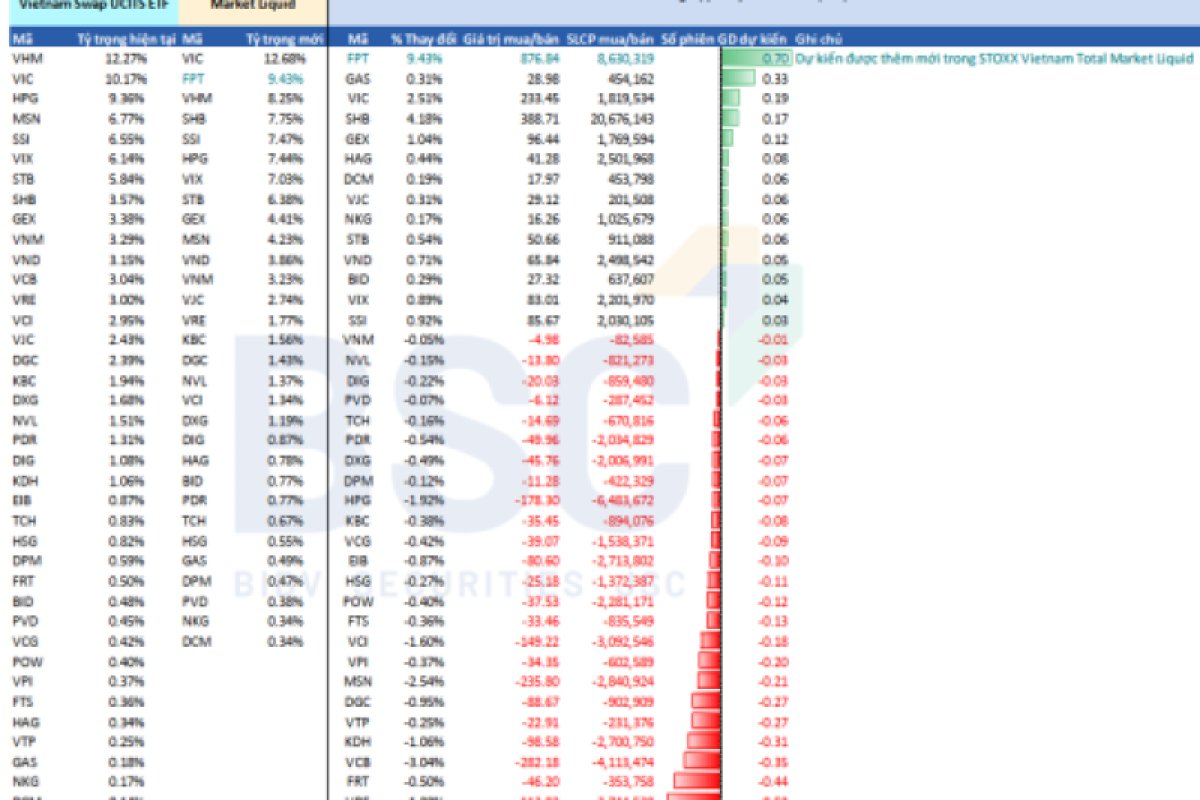 Mới đây thông tin từ BSC Research cho biết, quỹ FTSE Vietnam ETF quy mô 352 triệu USD sẽ đổi tên và chuyển chỉ số tham chiếu sang chỉ số STOXX Vietnam Total Market Liquid. Theo công ty quản lý tài sản DWS, quỹ FTSE ETF sẽ đổi tên từ "Xtrackers FTSE Vietnam Swap UCITS ETF" thành "Xtrackers Vietnam Swap UCITS ETF", đồng thời chuyển từ chỉ số FTSE Vietnam Index sang STOXX Vietnam Total Market Liquid. Chỉ số STOXX Vietnam Total Market Liquid sẽ trải qua kỳ review định kỳ vào tháng 3 và tháng 9 hàng năm. Theo DWS, việc thay đổi này nhằm cải thiện tính thanh khoản so với chỉ số trước đây. Giai đoạn chuyển tiếp kéo dài từ 17/07 đến 16/10, trong đó danh mục có thể được tái cơ cấu dần qua các giao dịch hoán đổi trên cả hai chỉ số. Theo dự báo của BSC Research dựa trên dữ liệu cuối tháng 8, FPT sẽ là cổ phiếu được mua nhiều nhất với khối lượng mua dự kiến lên đến 8.6 triệu cổ phiếu, chiếm tỷ lệ 0.7% danh mục. Bên cạnh FPT, SHB cũng được mua thêm với khối lượng lớn 20.7 triệu cổ phiếu. Các mã HAG, SSI, VIX và VND đều được bổ sung với khối lượng dưới 2 triệu cổ phiếu mỗi mã. Ở chiều ngược lại, ETF sẽ bán ra HPG với khối lượng lớn nhất 6.5 triệu cổ phiếu. Theo sau là VCB với 4.1 triệu cổ phiếu, VRE với 3.7 triệu cổ phiếu, VHM với 3.6 triệu cổ phiếu và KDH với 2.7 triệu cổ phiếu.Dự báo danh mục Quỹ FTSE ETF