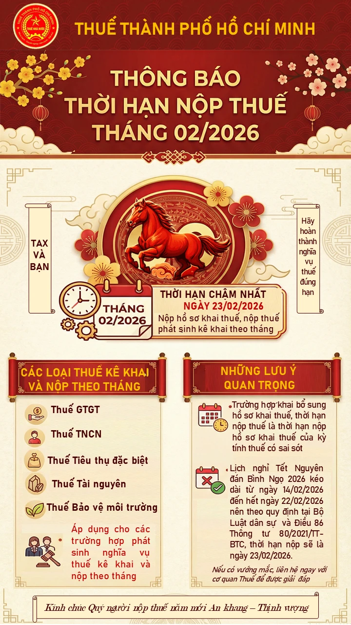 Trong tháng 2/2026, người nộp thuế (bao gồm tổ chức, cá nhân và hộ kinh doanh thuộc diện kê khai) cần thực hiện rà soát và lập hồ sơ cho các loại thuế sau: