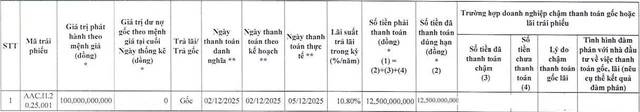 Theo đó, ngày 5/12/2025, Kiến trúc AA đã thực hiện thanh toán 12,5 tỷ đồng tiền gốc cho lô trái phiếu mã AAC.H.20.25.001, qua đó tất toán lô trái phiếu này đúng hạn.