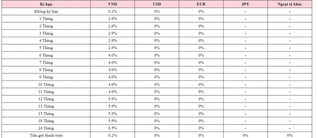 Cụ thể, lãi suất không kỳ hạn duy trì ở mức 0,1%/năm. Các kỳ hạn ngắn từ 1–2 tháng đang ở mức 2,1%/năm, kỳ hạn 3 tháng là 2,4%/năm.
