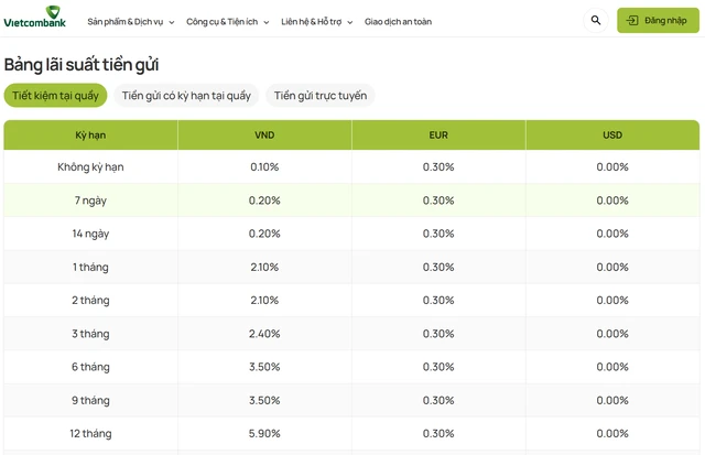 Tại Vietcombank, biểu lãi suất tiền gửi tại quầy cũng đã được điều chỉnh tăng đồng loạt.