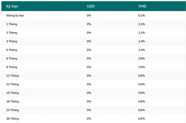 Theo đó, các kỳ hạn ngắn 1–2 tháng được niêm yết ở mức 2,1%/năm, kỳ hạn 3–5 tháng là 2,4%/năm. Lãi suất kỳ hạn 6–9 tháng đạt 3,5%/năm.
