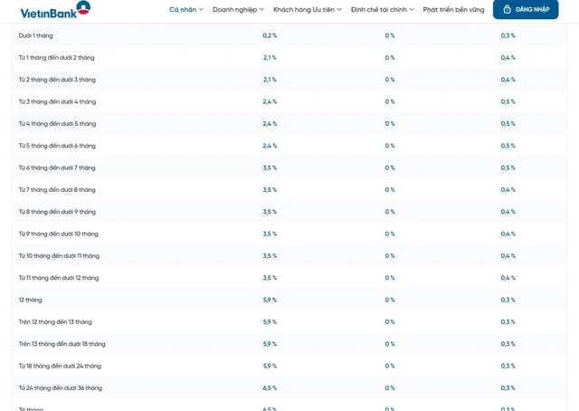 Ở kỳ hạn dài, lãi suất từ 12–18 tháng đạt 5,9%/năm, trong khi các kỳ hạn từ 24–36 tháng lên tới 6,5%/năm. So với trước đây, đây là bước điều chỉnh đáng kể, đưa VietinBank trở lại nhóm có lãi suất cạnh tranh trong khối ngân hàng quốc doanh.