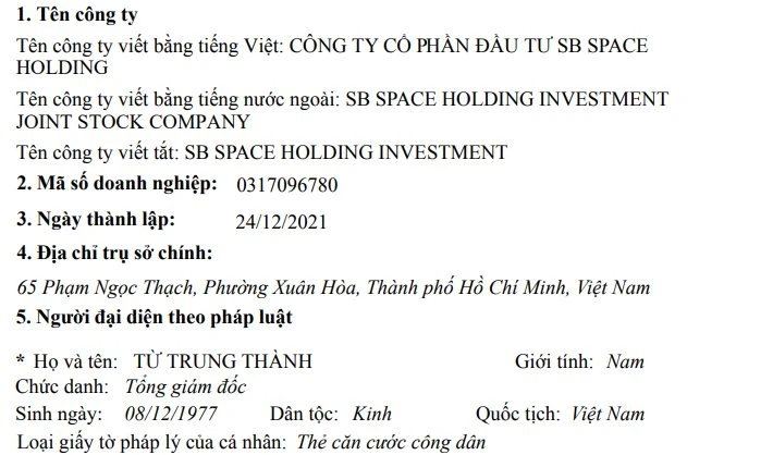 SB Space Holding được thành lập ngày 24/12/2021, đặt trụ sở tại đường Phạm Ngọc Thạch, phường Xuân Hòa, TPHCM (trước đây là phường Võ Thị Sáu, quận 3).