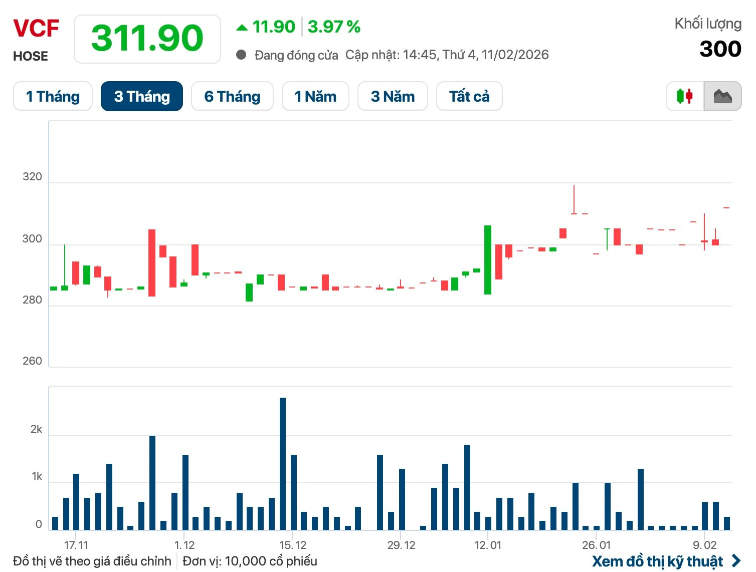 Trên thị trường chứng khoán, cổ phiếu VCF kết phiên giao dịch ngày 11/2 ở mức 311.900 đồng/cp, là một trong những cổ phiếu đắt sadn HOSE. Vốn hoá thị trường đạt hơn 8.000 tỷ đồng.
