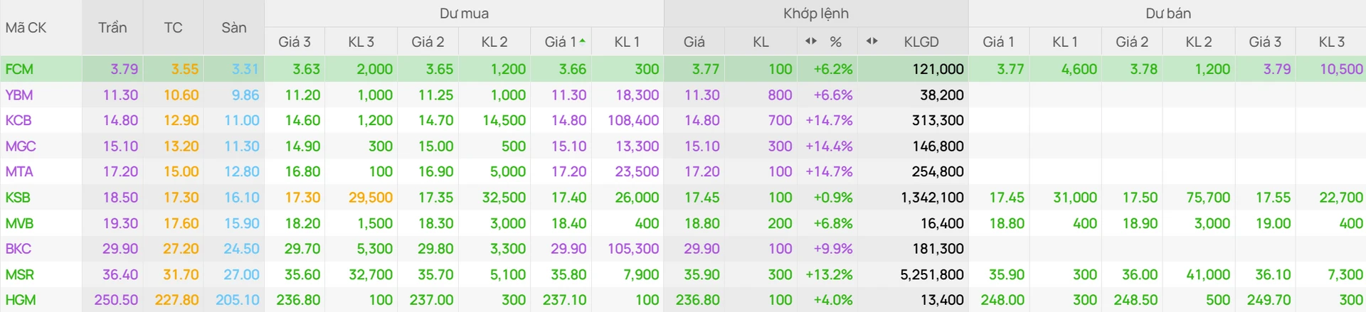 Trong bối cảnh chung giằng co, sức nóng của nhóm khoáng sản là đáng chú ý. Nhiều cổ phiếu khác cũng tăng mạnh, như HGM (+9,7%), MVB (+8%), FCM (+6,5%), tạo nên một “làn sóng xanh” hiếm thấy giữa thị trường đang phân hóa.