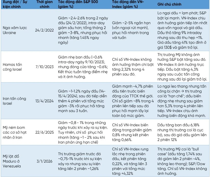 Theo thống kê dữ liệu lịch sử của Chứng khoán VPBank (VPBankS) về các cuộc xung đột quân sự lớn và tác động tới S&P 500 cùng VN-Index, thị trường Việt Nam thường chỉ rung lắc trong 1-2 phiên rồi dần “shake off” nếu xung đột không lan rộng hoặc kéo dài.