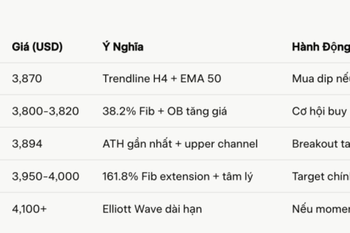 - Kịch Bản Chính (Bullish – 65% Xác Suất): Giá consolidate sideways quanh 3,880-3,900 USD sau pullback nhẹ, rồi breakout upper channel vào thứ Tư-Thứ Năm. Target: 3,950 (ngắn hạn), 4,000 USD (cuối tuần). Rủi ro: Dữ liệu lạm phát EU/Mỹ yếu hơn dự kiến.