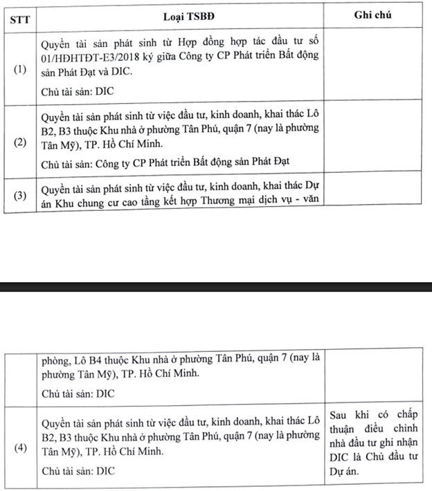 - Quyền tài sản phát sinh từ việc đầu tư, kinh doanh, khai thác lô B2, B3 thuộc Khu nhà ở phường Tân Mỹ. Sau khi có chấp thuận điều chỉnh nhà đầu tư ghi nhận DIC là chủ đầu tư dự án.