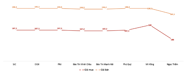 Tại khu vực phía Nam, Ngọc Thẩm là đơn vị duy nhất ghi nhận giá bán tăng mạnh hơn giá mua, kéo chênh lệch mua, bán lên 5 triệu đồng/lượng. Đây mức chênh lệch cao nhất trong phiên sáng nay khi chênh lệch phổ biến trên thị trường chỉ ở mức 3 triệu đồng.