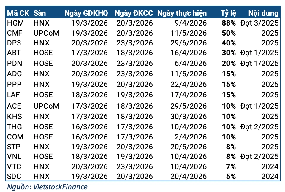 Cái tên nổi bật nhất tuần tới là HGM với tỷ lệ 88%, là tạm ứng cổ tức đợt 3/2025. Với khoảng 12.6 triệu cp đang lưu hành, Doanh nghiệp dự kiến chi gần 111 tỷ đồng cho đợt thanh toán này. Ngày giao dịch không hưởng quyền là 19/03 và thời gian thanh toán dự kiến vào 09/04.