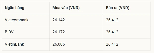 Các ngân hàng thương mại lớn cũng đồng loạt giữ giá giao dịch quanh vùng 26.412 đồng/USD, cho thấy áp lực cung – cầu trên thị trường không có biến động khiến hệ thống ngân hàng chưa cần điều chỉnh biểu tỷ giá.