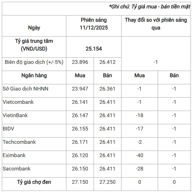 Tỷ giá USD trong nước hôm nay 11/12/2025