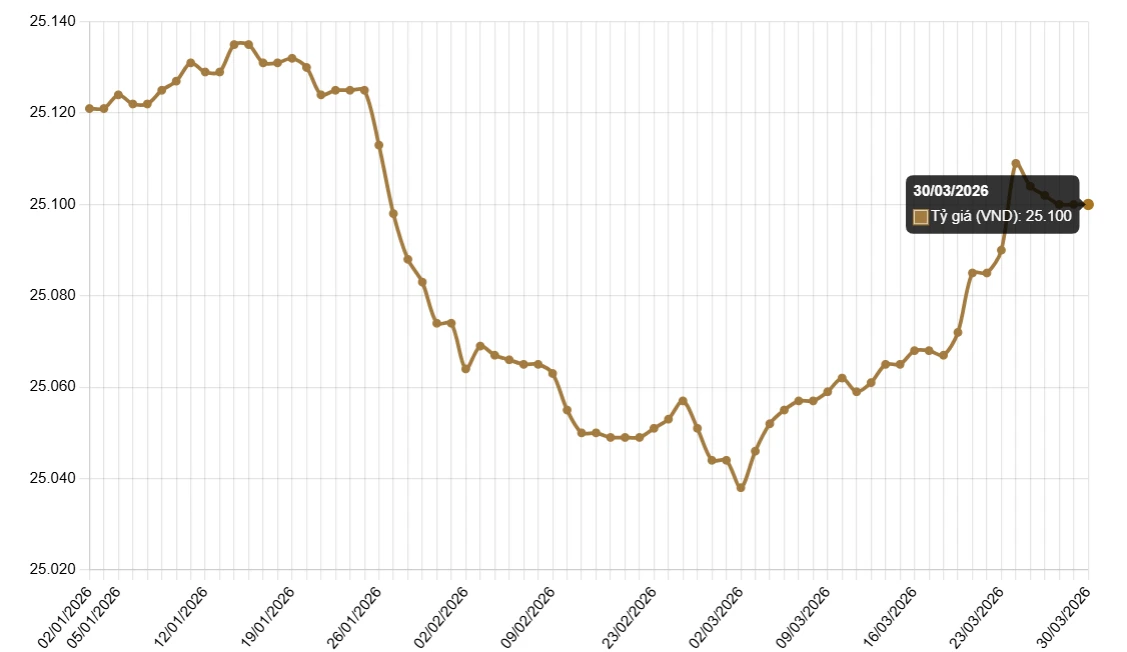 Ngân hàng Nhà nước công bố tỷ giá trung tâm ở mức 25.100 VND/USD, không đổi so với ngày 27/3. Biên độ ±5% tương ứng trần 26.355 VND/USD, sàn 23.845 VND/USD.