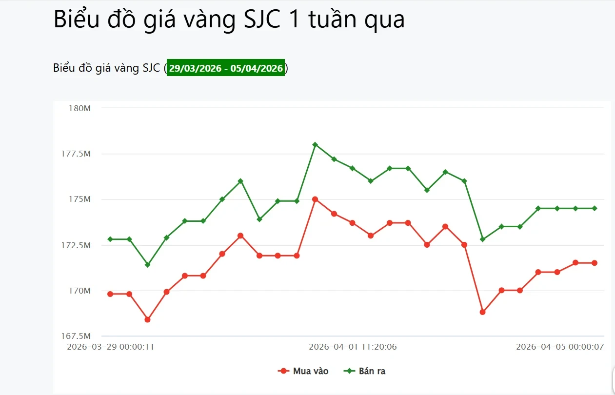 Giá vàng SJC ngày 5/4 là 174,5 triệu đồng/lượng ở lượt bán ra và 171,5 triệu đồng ở chiều mua vào. Tính chung trong tuần từ 29/3 đến 5/4/2026, giá vàng trong nước ghi nhận diễn biến biến động theo dạng tăng, điều chỉnh, và hồi phục nhẹ.