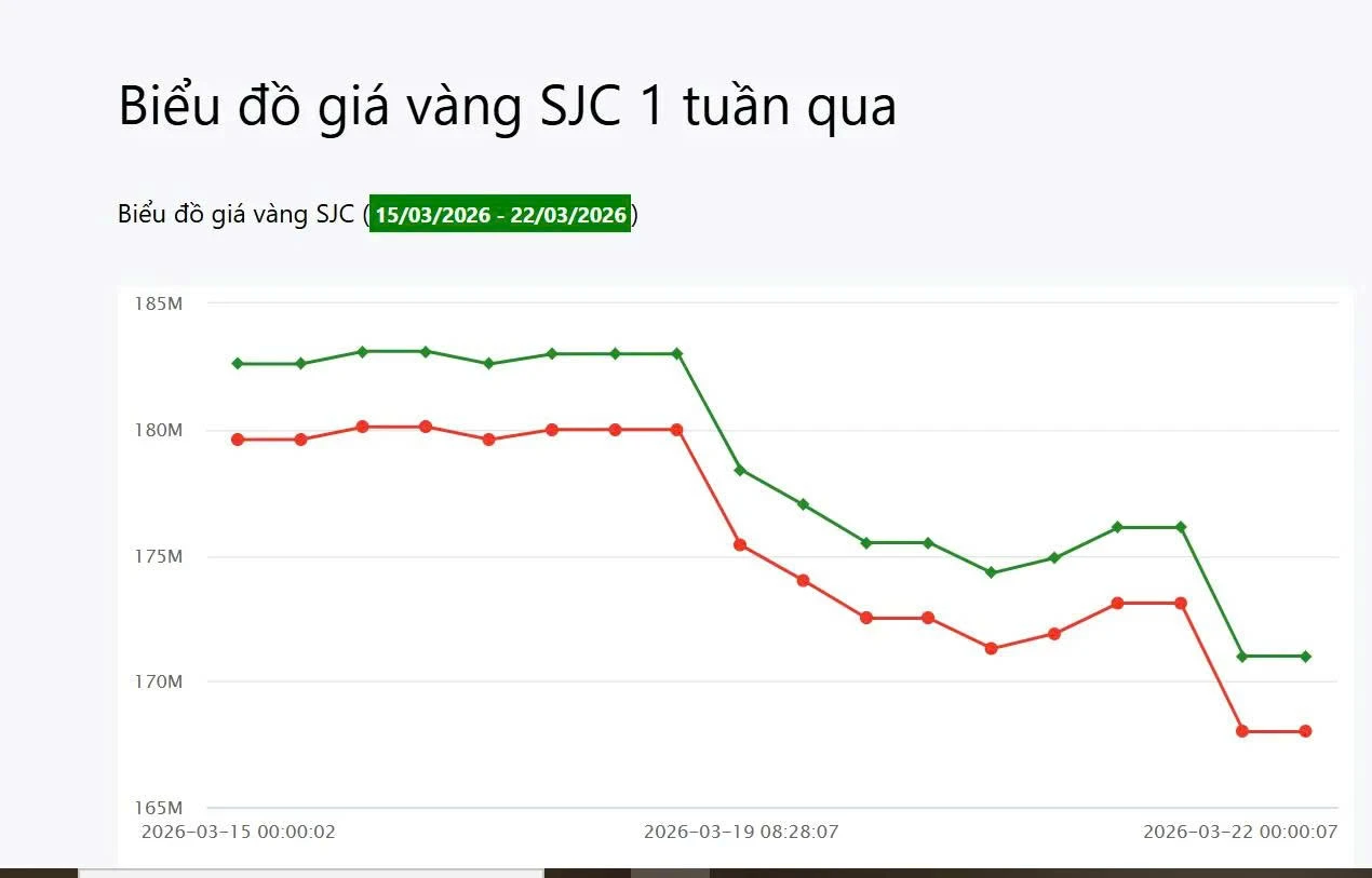 Cuối tuần, ngày 22/3, giá tiếp tục giảm sâu, rơi về quanh vùng 171 triệu đồng/lượng ở chiều bán ra và khoảng 168 triệu đồng/lượng ở chiều mua vào, mức thấp nhất trong tuần.