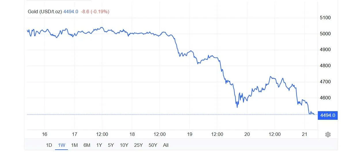 Theo Trading Economics, giá vàng thế giới ngày 21/3 xuống còn 4.494 USD/ounce, thấp nhất trong vòng 6 tuần qua. Nguyên nhân là do căng thẳng leo thang ở Trung Đông khiến giá năng lượng tăng vọt và hy vọng về việc cắt giảm lãi suất trong thời gian ngắn suy giảm.