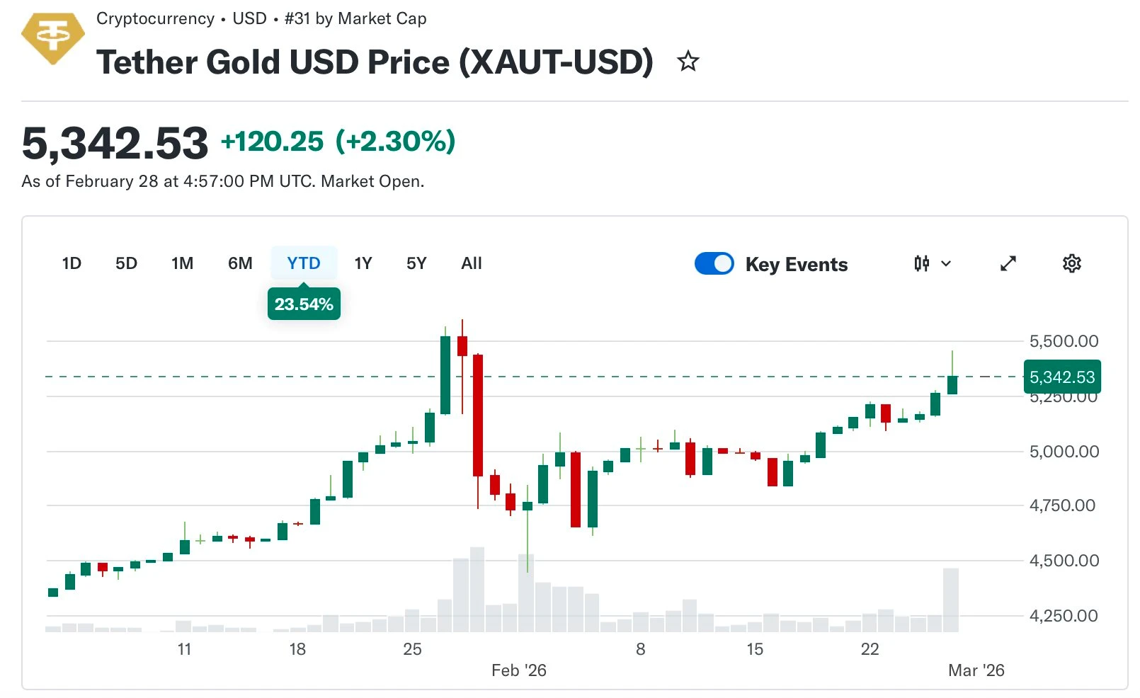 XAUT và PAXG tăng vọt bất chấp thị trường vàng tài chính truyền thống đóng cửa cuối tuần, tạo ra mức chênh lệch đáng kể so với giá vàng vật chất. Trước đó, giá vàng thế giới (XAU) cũng đã bật tăng vượt ngưỡng 5.200 USD/oz do nhu cầu trú ẩn an toàn khi lo ngại bất ổn địa chính trị leo thang. Chênh lệch này phần nào cho thấy kỳ vọng của nhà đầu tư vào đà tăng giá vàng.
