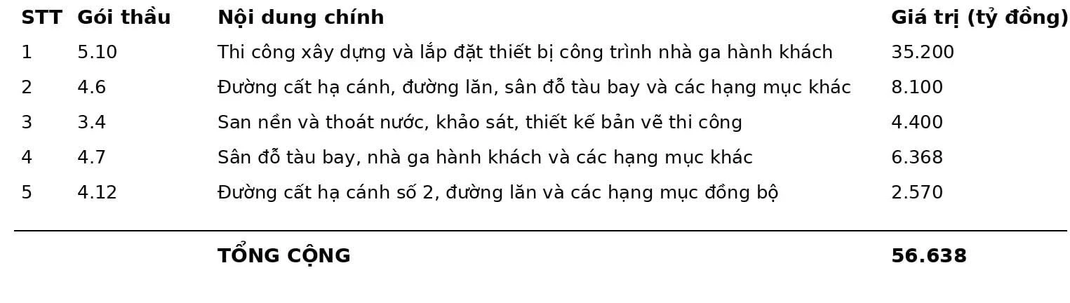 Lớn nhất là gói thầu 5.10 – “Thi công xây dựng và lắp đặt thiết bị công trình nhà ga hành khách” với tổng giá trị hơn 35.200 tỷ đồng và thời gian thi công 39 tháng.