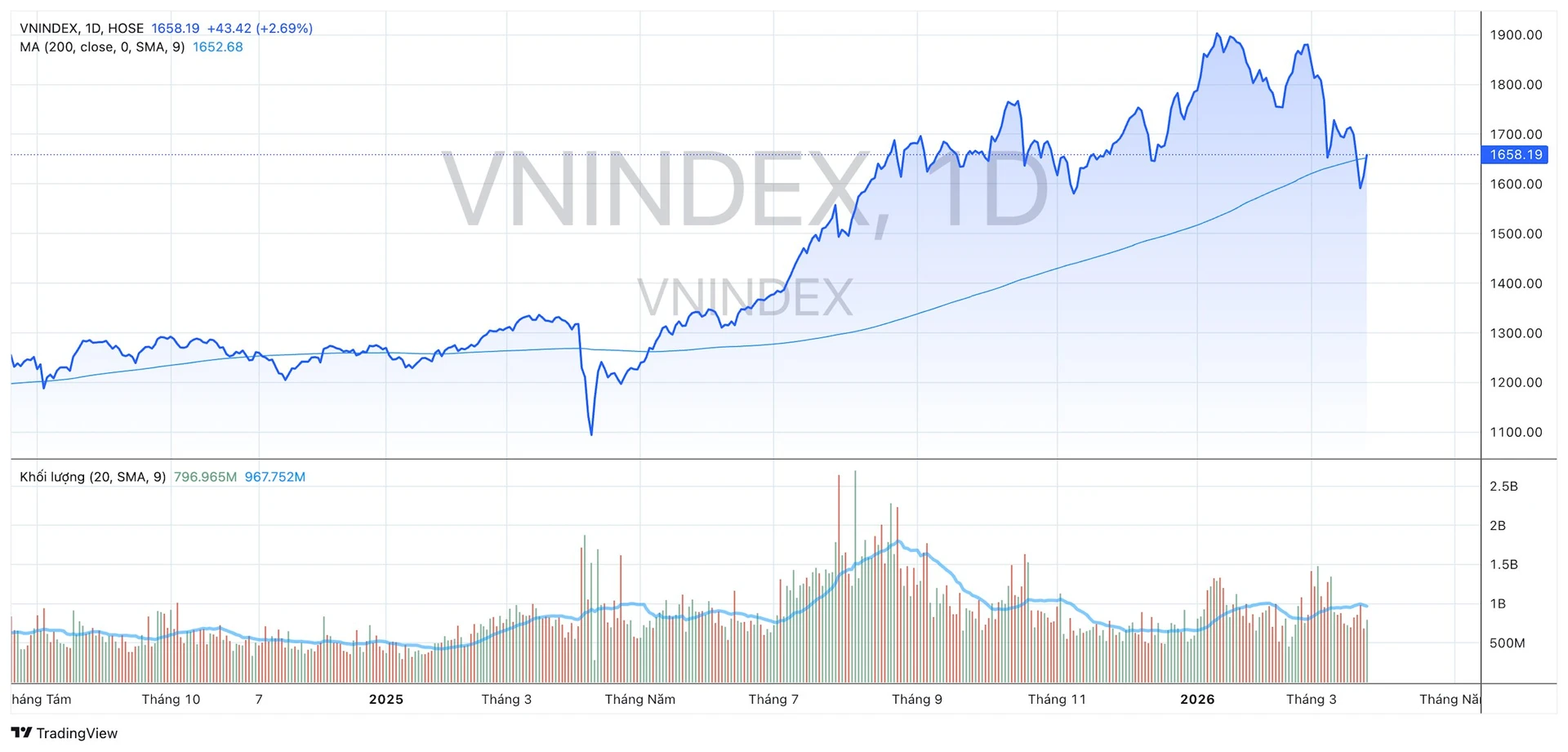 Điểm tích cực là VN-Index đã nhanh chóng phục hồi sau khi chạm vùng đáy 7 tháng, vượt qua mức MA200 và ghi nhận những nhịp tăng trưởng trở lại. Đóng cửa phiên giao dịch 25/3, VN-Index tiếp tục tăng 43 điểm, qua đó vươn lên mốc 1.658 điểm, song thanh khoản lại chưa thật sự bùng nổ.