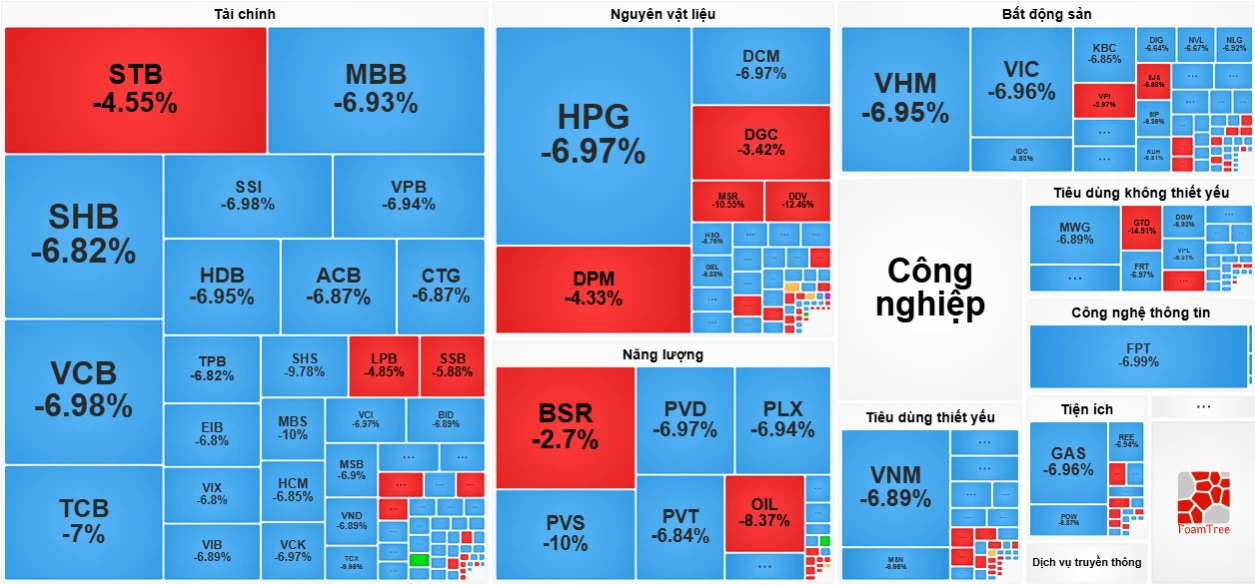 Kết phiên 09/03, VN-Index giảm hơn 115 điểm (-6.51%), còn 1,652.79 điểm, ghi nhận phiên giảm điểm kỷ lục về mặt điểm số. Tương tự, HNX-Index cũng giảm 7.21%, còn 235.36 điểm. Toàn thị trường có 350 mã giảm sàn, 509 mã giảm giá, và chỉ có 54 mã tăng giá, 9 mã tăng trần.