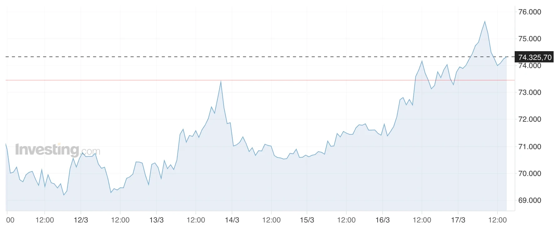 Trong phiên giao dịch châu Á ngày thứ Ba, đồng tiền số lớn nhất thế giới có thời điểm chạm ngưỡng 75.988 USD trước khi điều chỉnh nhẹ về quanh 74.300 USD. Diễn biến này cho thấy lực cầu vẫn đang duy trì ổn định, bất chấp áp lực chốt lời ngắn hạn.