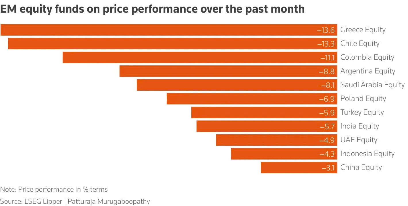 Dựa trên tính toán của LSEG Lipper, các quỹ cổ phiếu tập trung vào Pakistan, Chile, Hy Lạp, Colombia, Argentina, Các Tiểu vương quốc Ả Rập Thống nhất (UAE) và Ả Rập Xê Út đều nằm trong nhóm giảm mạnh nhất trong tháng qua, trong số 518 hạng mục được theo dõi.
