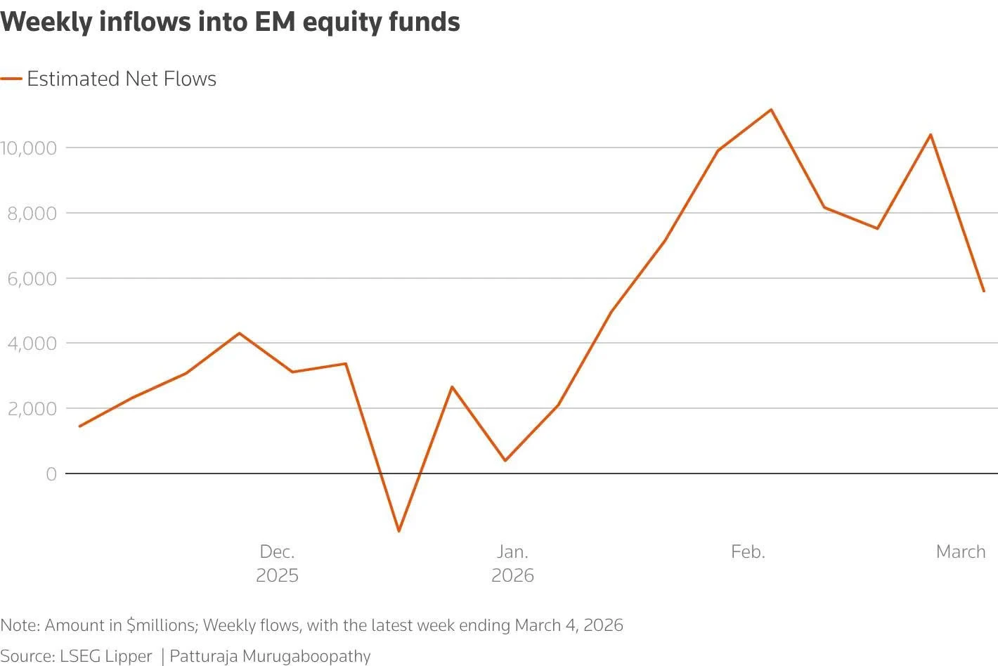 Dữ liệu dòng vốn hàng tuần, theo dõi khoảng 13.000 quỹ cổ phiếu thị trường mới nổi cho thấy dòng vốn chảy vào chỉ ở mức 5,8 tỷ USD trong tuần này – mức thấp nhất trong 7 tuần.